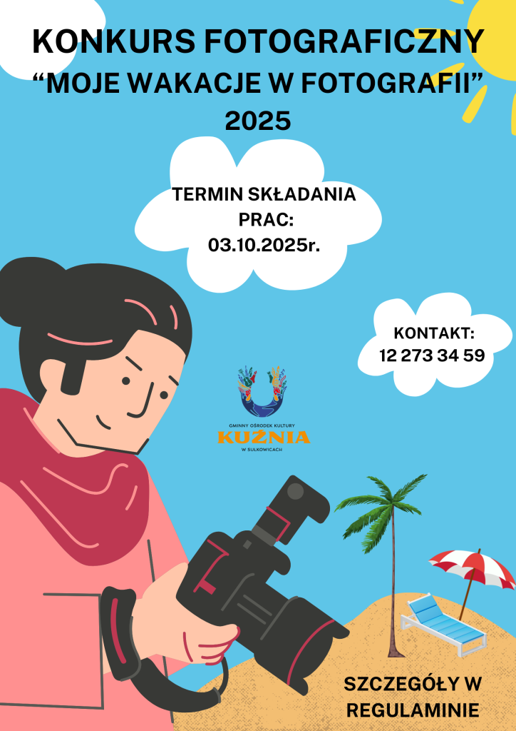 KONKURS FOTOGRAFICZNY „MOJE WAKACJE W FOTOGRAFII” 2025 2 lip,2025 Gminny Ośrodek Kultury "Kuźnia" Gminny Ośrodek Kultury „KUŹNIA” w Sułkowicach zaprasza do udziału w Konkursie Fotograficznym „Moje Wakacje w Fotografii” 2025.Konkurs trwa do 03.10.2025r.Szczegóły konkursu w regulaminie poniżej.Na zwycięzców czekają nagrody!Oświadczenie Konkurs FotograficznyRegulamin Konkursu Fotograficznego