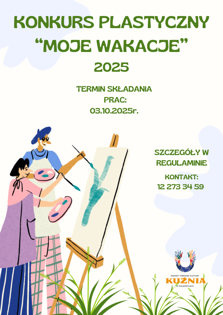 KONKURS PLASTYCZNY „MOJE WAKACJE” 2025 3 lip,2025 Gminny Ośrodek Kultury "Kuźnia" Gminny Ośrodek Kultury „KUŹNIA” w Sułkowicach zaprasza do udziału w Gminnym Konkursie Plastycznym pt. „MOJE WAKACJE” 2025.Konkurs trwa do 03.10.2025r.Dla zwycięzców przewidziane nagrody!Oświadczenie Konkurs PlastycznyRegulamin Konkursu Plastycznego
