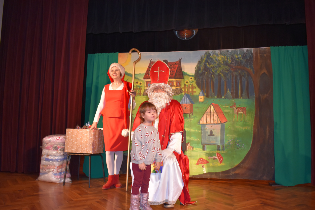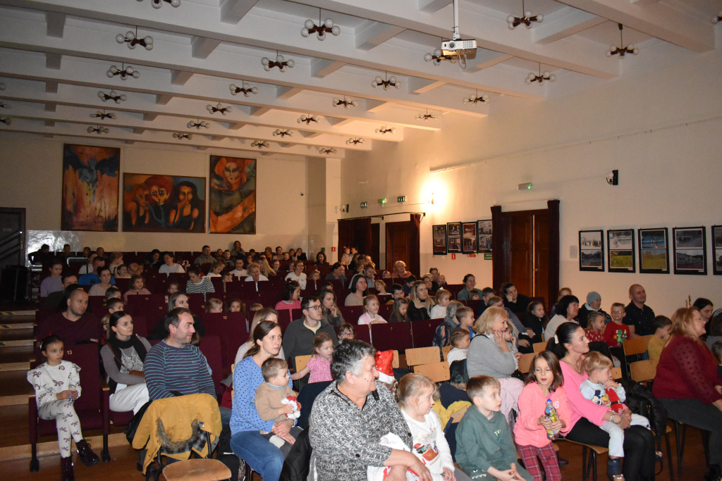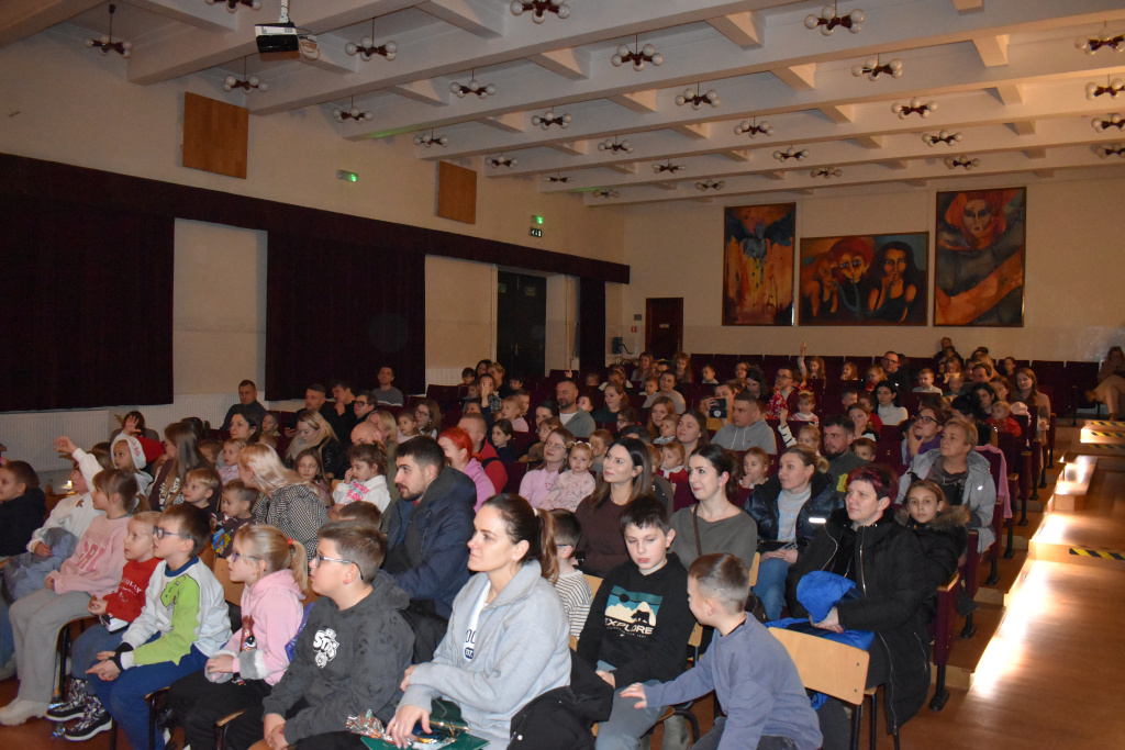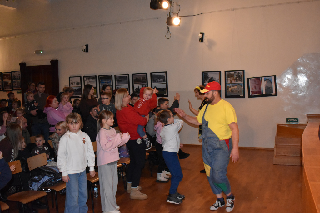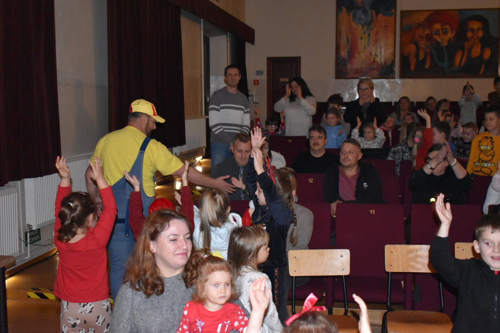 Nie mogło oczywiście zabraknąć najważniejszego gościa grudniowych wydarzeń – Świętego Mikołaja! Po zakończonych spektaklach pojawił się na scenie, by obdarować dzieci drobnymi upominkami, wywołując prawdziwą falę radości i ekscytacji.