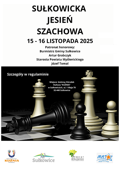 Gminny Ośrodek Kultury „KUŹNIA” w Sułkowicach zaprasza na Turniej Szachowy, który odbędzie się 15-16 listopad 2025r. Szczegóły w regulaminie poniżej. …